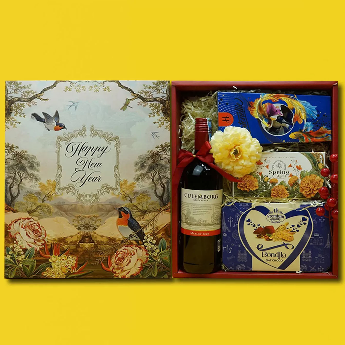 Sản phẩm chính: Hộp quà Tết chứa một chai rượu vang Culemborg Merlot, nổi bật với hương vị nhẹ nhàng, mềm mượt và dễ uống. Rượu vang này được làm từ giống nho Merlot trồng ở Nam Phi, mang lại hương trái cây đậm đà như anh đào, mâm xôi, và các gia vị nhẹ nhàng, tạo nên một trải nghiệm thưởng thức êm ái và hài hòa.